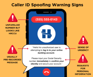Spoofing calls are the first type of scam we want to highlight. Spoofing calls are the most common financial scam we have experienced at HRCCU. However, this type of scam is not unique to HRCCU as spoofing is a common occurrence across many types of institutions. What is Spoofing?