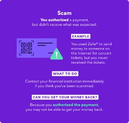 “When you enroll with Zelle®, your bank sends you a security code to verify your identity. The scammer lies that they need this passcode to authorize your payment to yourself. If the scammer is given the one-time passcode, they’ll be able to enroll THEIR bank account with Zelle® using your email or phone number. Now the money you thought you were sending to yourself is sent directly to their bank account.”